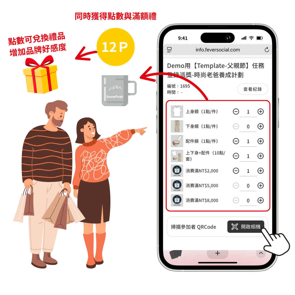 門市人員開啟實體活動小幫手記錄顧客完成的任務,並派發不同獎勵,顧客可以額外用點數兌換禮品