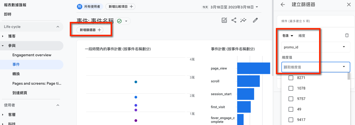 新增篩選器 》 選擇 promo_id 》勾選 活動 ID,你就可以查看該活動的成效。