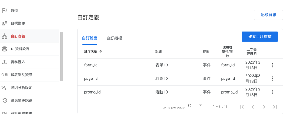若要在 GA 報表使用客製的參數查詢,你需要先將他們定義為可使用的維度 (Custom dimension)。