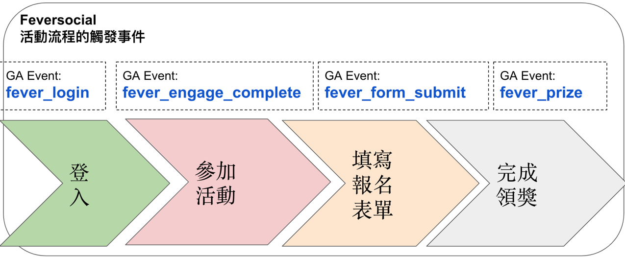 發燒互動的流程可以拆解成這幾個步驟,根據你的活動設定,我們會自動發射這些事件到你的 GA4。