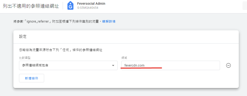 假設你在發燒互動平台的子網域為 event.website.com。你在 event 的網頁中使用了 embed 元件, 且元件中有一個官網連結。如果 User 點擊這個連結訪問你的官網, GA4 會以為 user 來自於 fevercdn.com 這個網域。但實際上 User 只是從你的 event.website.com 的頁面進入你的官網 (website.com)。因此建議你在 GA4 設定排除這個網域。