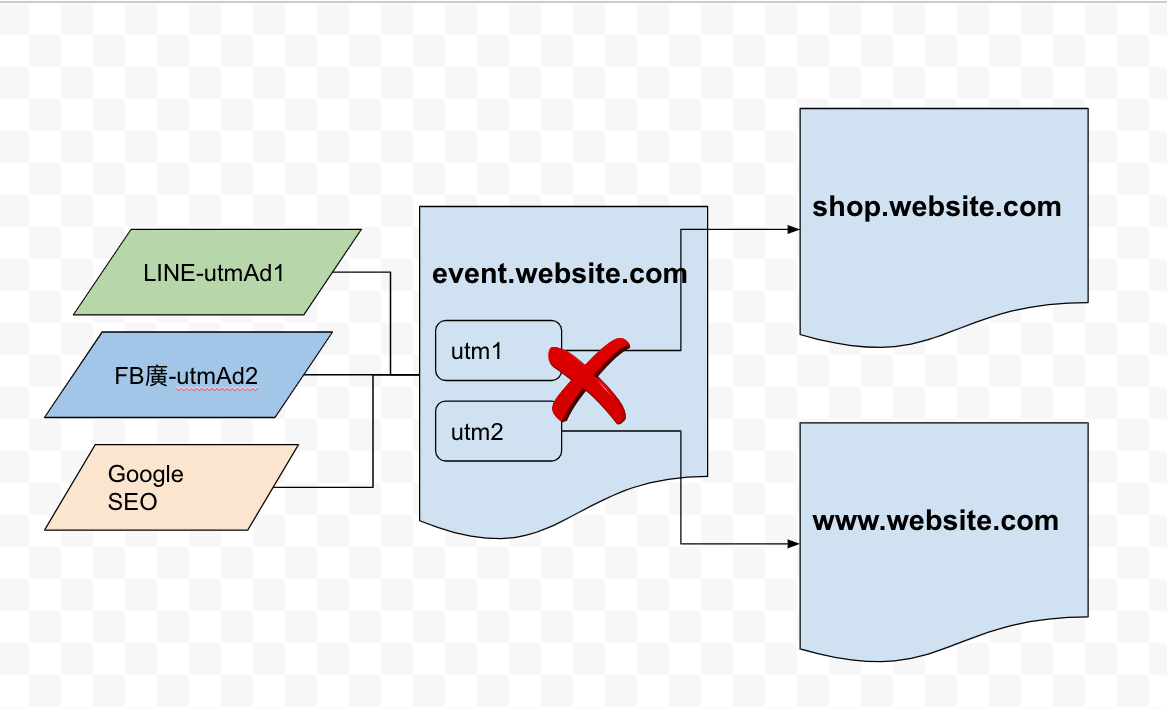 假設你把 event 頁面拿去推播到 Line 或去打廣告,你在 URL 上使用了 utmAd1,和 utmAd2 這2組 utm 參數。同時,你在 event 頁面的按鈕或卡片上,用了另外2組 utm 參數。當 user 進入 event 頁面點擊頁面的按鈕連結時,Google 會重新計算 user 的來源。如果你想知道有多少人從 Line 推播點入,最後進入 shop 買東西,你是無法追蹤到的,因為中途就被 event 上的按鈕攔截了。shop 無法知道 user 是從 Line/廣告或甚至 Google SEO 來的。 因此,千萬不要在子網域頁面上的連結加上utm 參數。