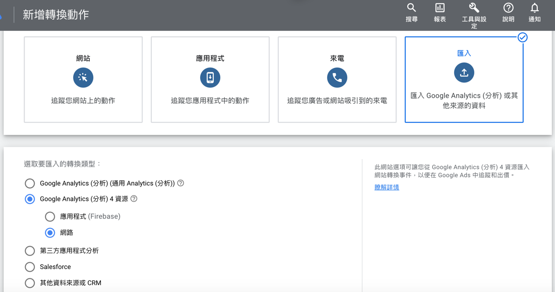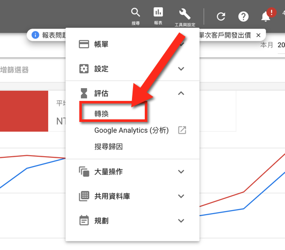 請到 Google Ads 的後台,從工具與設定中進入轉換: