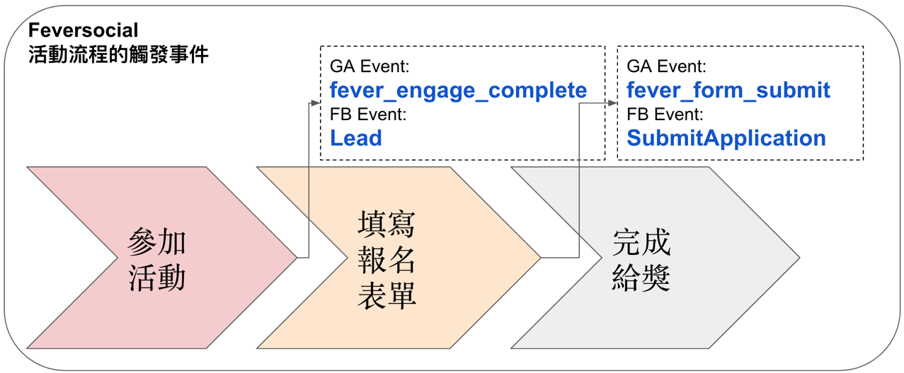 我們的平台在活動流程中有設計 2 個觸發事件。一個是成功參加活動,一個是成功填表。這 2 個觸發事件會直接寫入你所設定的GA 帳號。