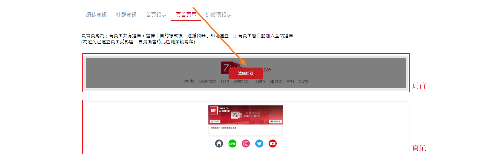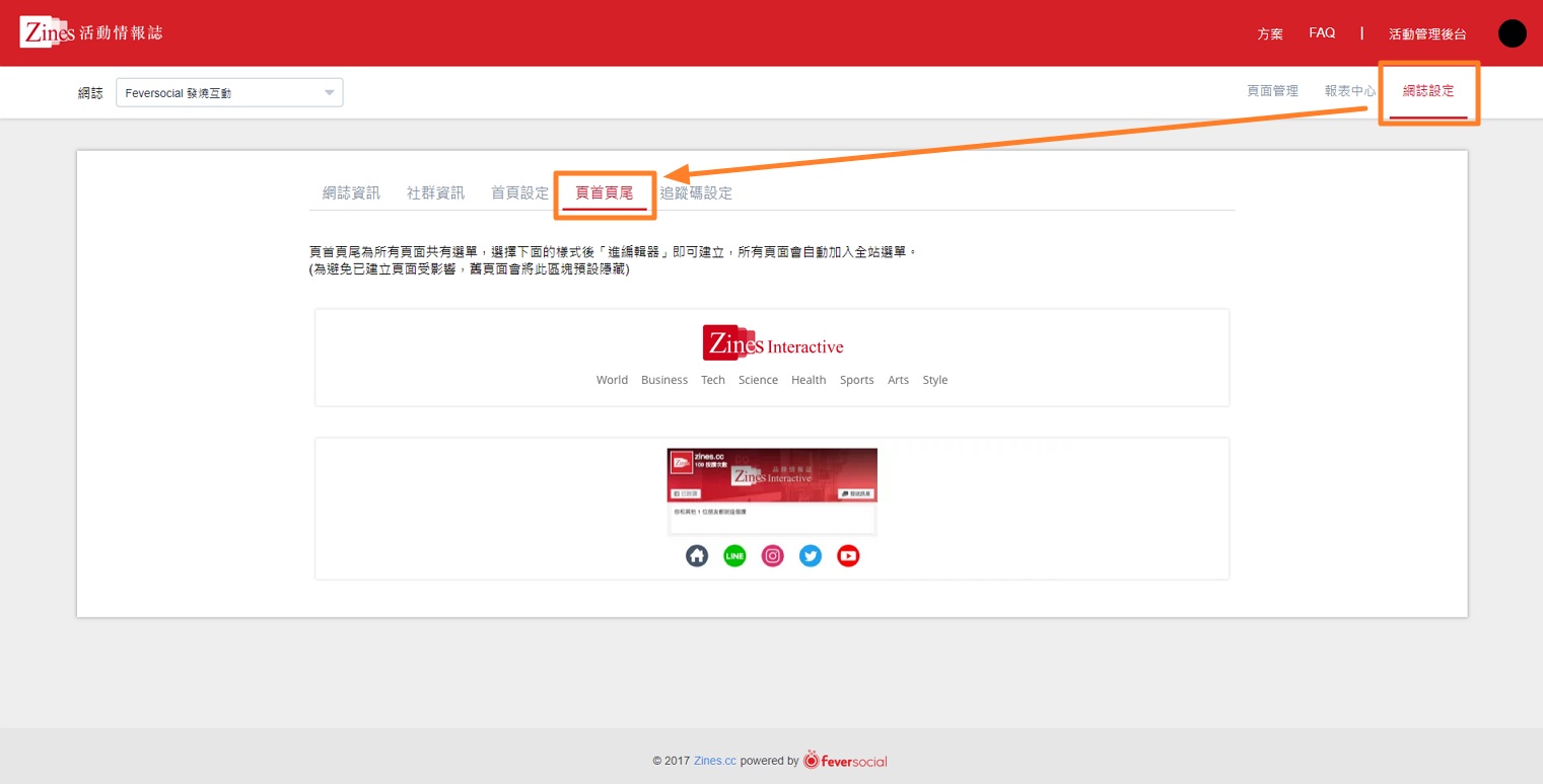 1. 登入「網頁管理後台」,在右上角找到「網誌設定」,並選擇「頁首頁尾」選項