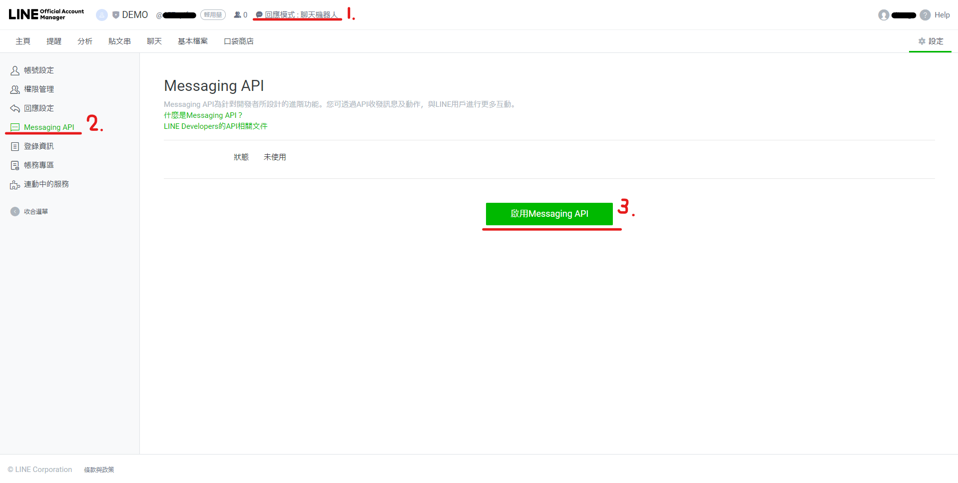 你需要將官方帳號納為Provider其中之一Channel(Messaging API),若你的官方帳號尚未關聯至Provider,請參考上一步:由OA官方帳號建立/關聯Provider。