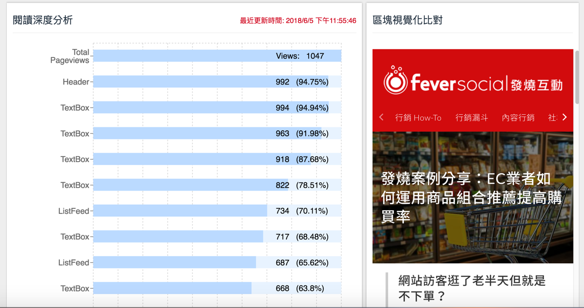 由於發燒互動的網頁編輯器是版塊式編輯,因此我們可以很清楚的追蹤每個內容區塊被閱讀的比例。坊間的架站工具或部落格平台如 wordpress,無法提供如此細緻的數據。
