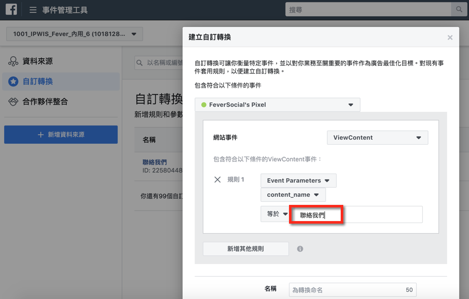 比方說,你的頁面上有「聯絡我們」的按鈕,你想把這個點擊設定為目標轉換,你便可以選擇 ViewContent 這個事件,然後訂定規則,把 Event 的 content_name 參數設定為「聯絡我們」,也就是 Button 上的文字。(這個思維其實跟 GA 的 Goal 設定是一樣的概念。)