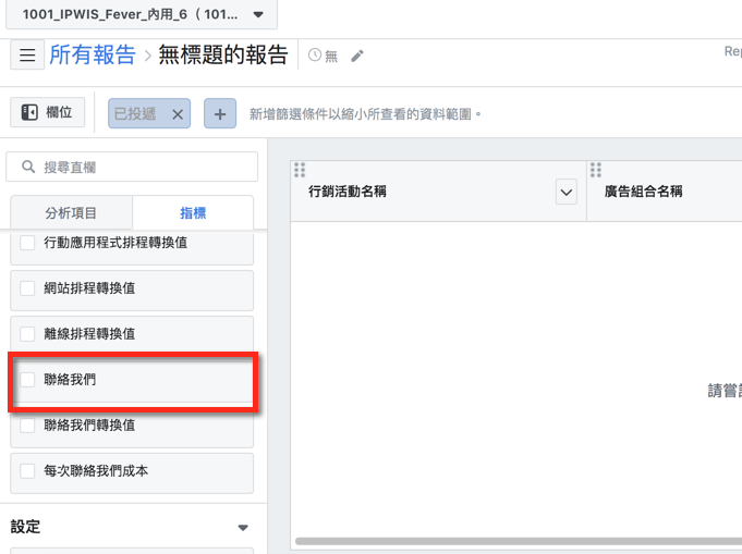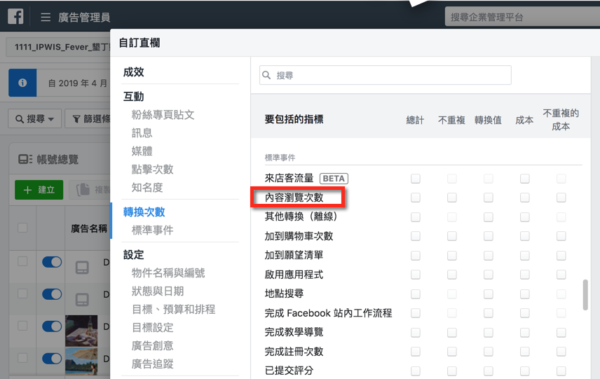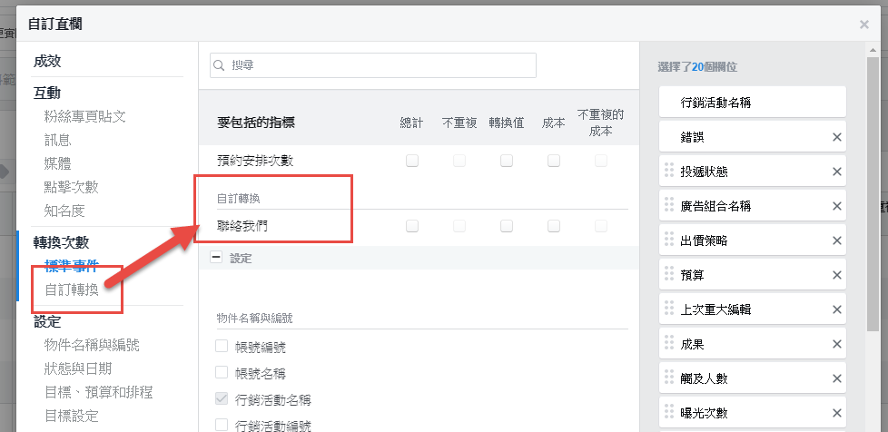 建立自訂轉換後,你就可以在廣告管理員以及FB廣告分析報表的指標中看到這個選項。
