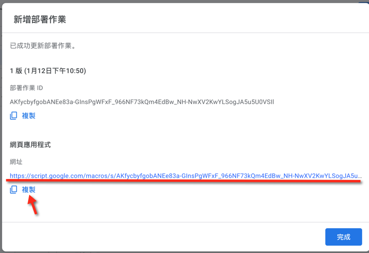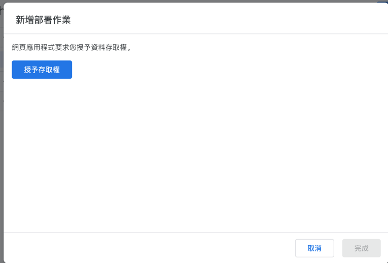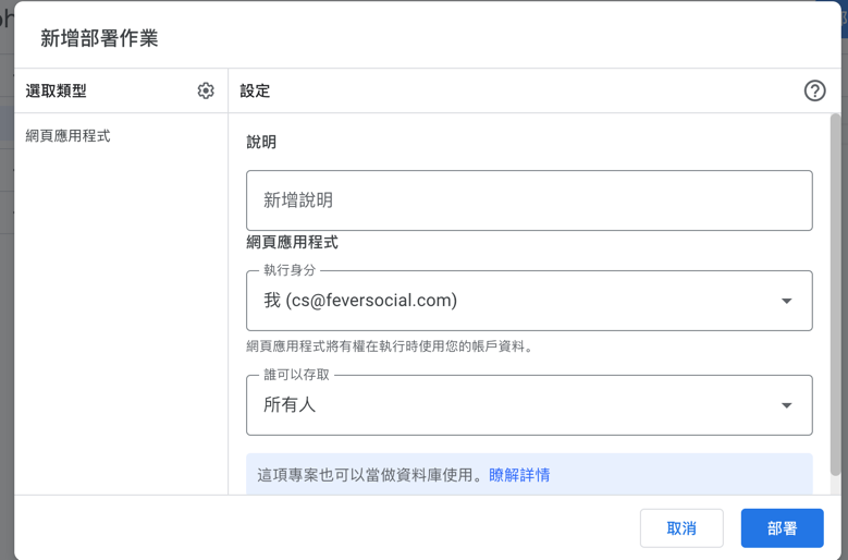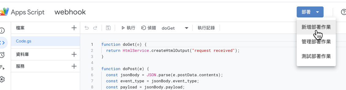 此時頁面會開啟另一個頁面,點擊新增部署作業,準備將程式 [ 部署為網路應用程式 ]