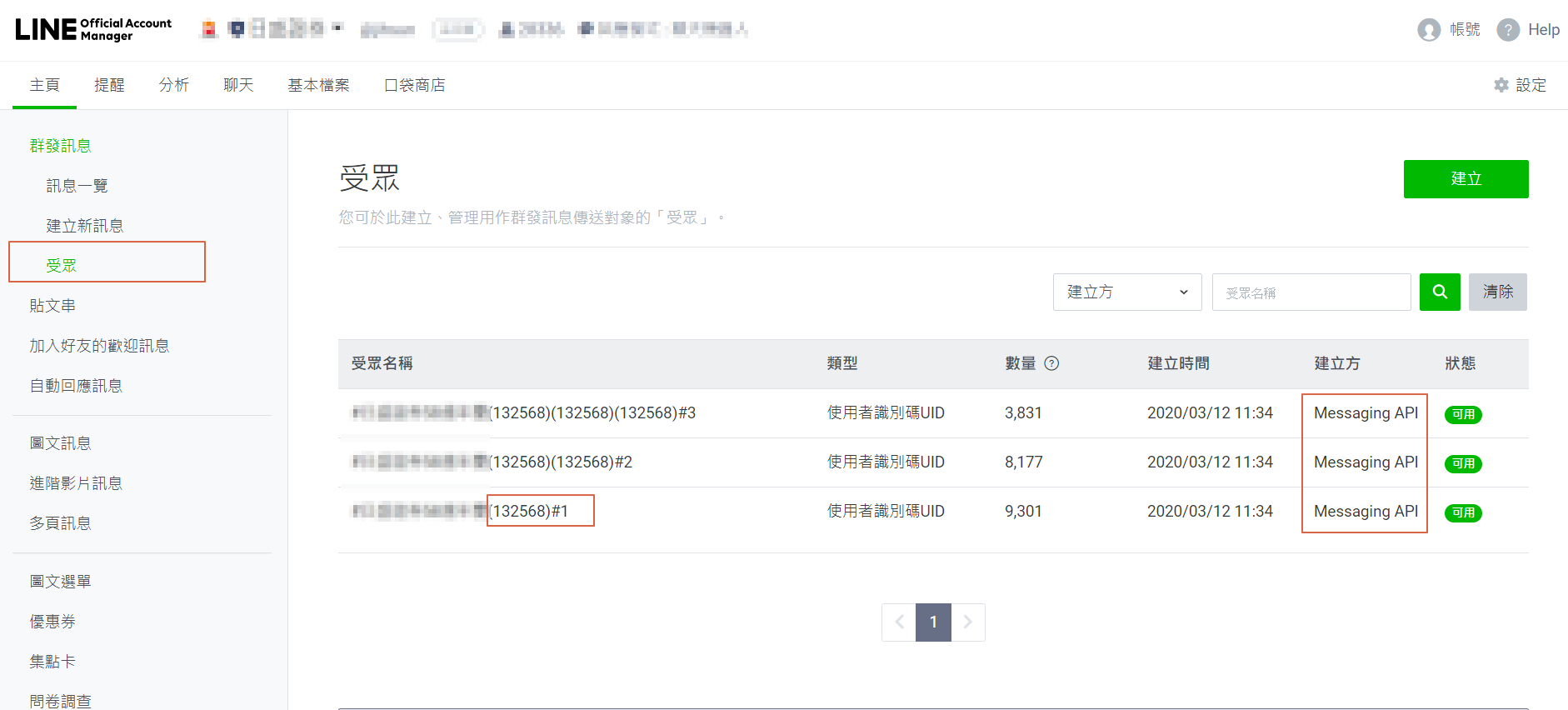 透過發燒互動後台的自動打包的功能,受眾名稱會以活動標題為命名,建立方會標註為 Messaging API。若此檔活動名單量較大,將自動分包。(LINE 一包受眾不能超過 10000 個 ID)