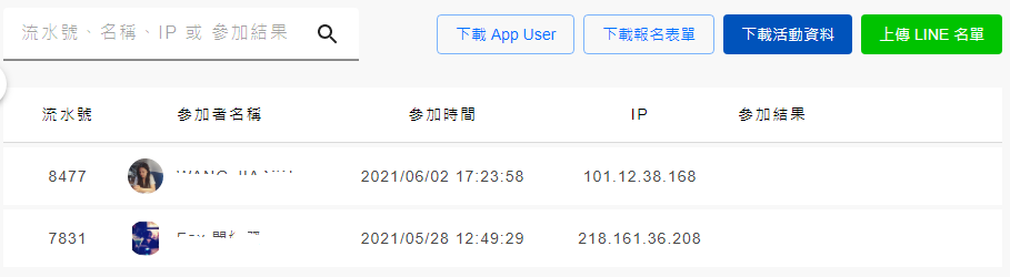 你可以在每一檔活動的參加者列表管理頁,把此活動的所有參加者 LINE 用戶 ID,一鍵上傳到你的 LINE 官方帳號後台(LINE OA 原生後台)