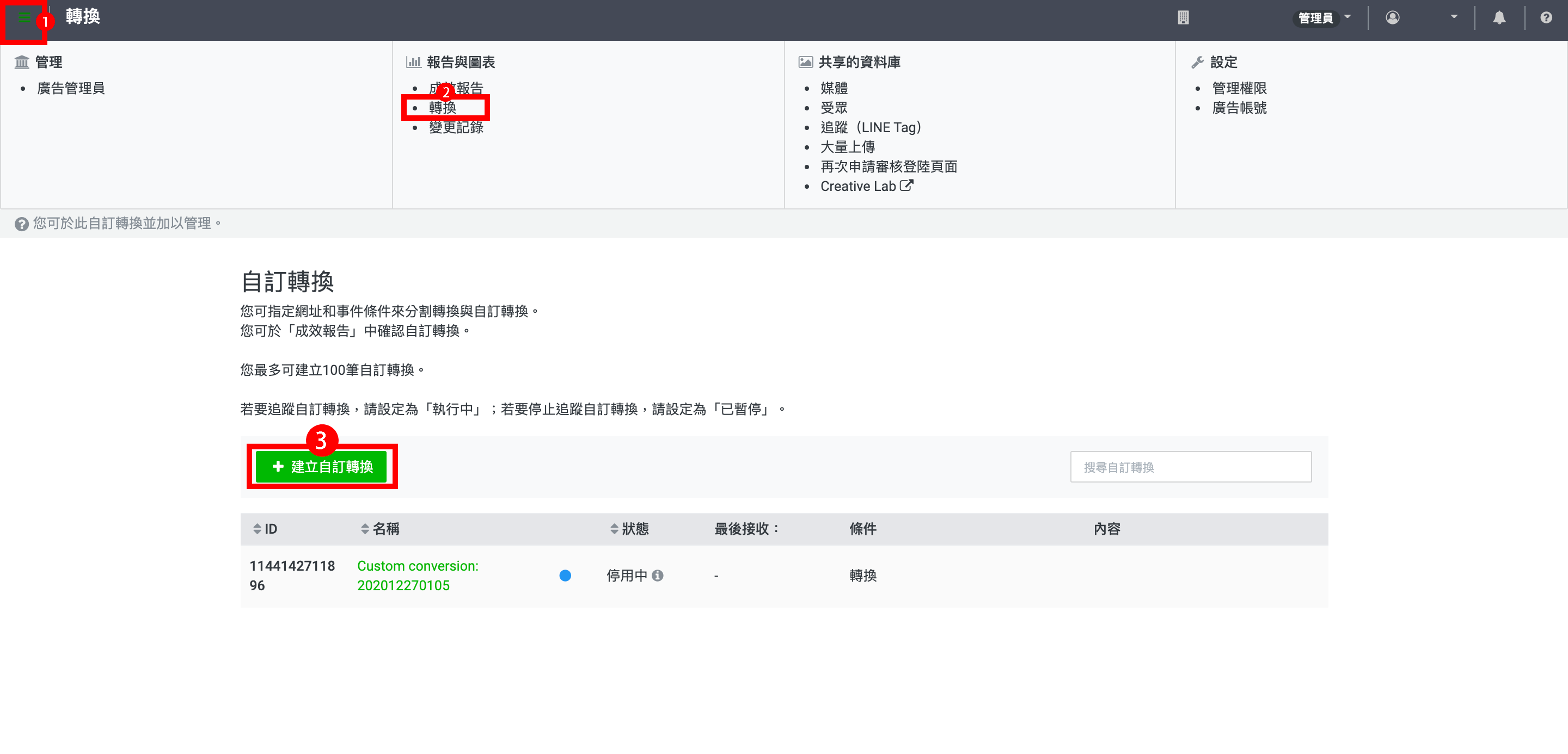 如果你使用 LINE LAP 廣告平台,你可以在廣告後台自定義成功轉換事件,就可以在報表直接查看轉換數據。
