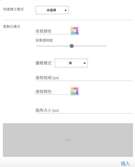 在編輯器可以直接插入 DIV,編輯器提供了一些簡單的設定,可以讓你設定 DIV 格子的背景底色、透明度,以及邊框的顏色/圓角的弧度等。