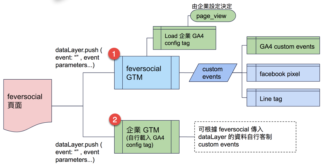 1. 發燒互動的數據流設計是把網頁發生的事件透過 dataLayer 發到我們的 GTM, 再由 GTM 統一處理所有需要發射的追蹤碼 (包括 GA4, Facebook Pixel, Line tag 等)。