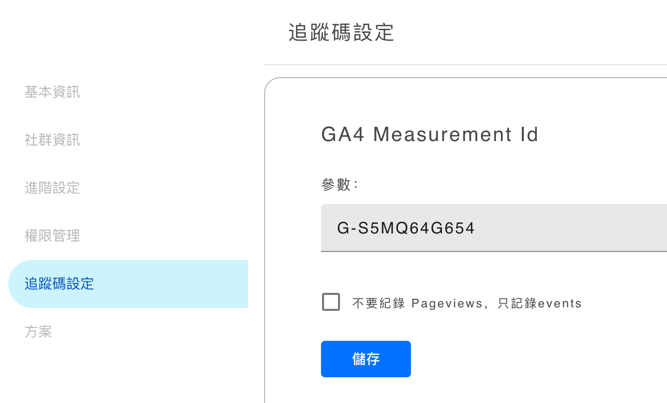 我們開放埋放的標準追蹤碼有:Google Analytics (GA4)、Google Tag Manager (GTM)、Google Ads Remarketing Conversion ID(再行銷代碼)、Facebook Pixel (FB像素)、Line Tag;除了上述追蹤碼,若你還有其他需要埋碼追蹤的部分,你可以將該程式碼放入GTM,透過GTM的方式放進網頁。