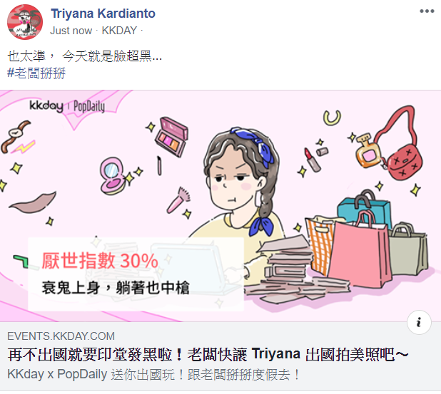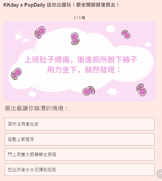 KKday與媒體業者PopDaily 合作, 完成了【厭世女孩蹺班大作戰】,使用發燒互動心理測驗模組及網頁編輯器架設活動網站, 以下內容節錄自數位時代