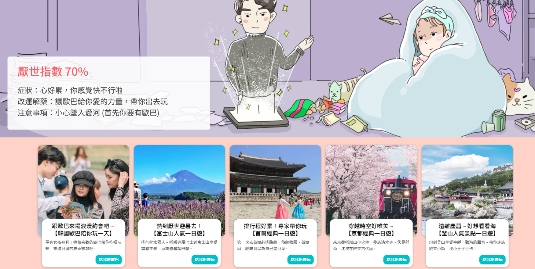 符合KKday需求與PopDaily社群樣貌的主題「厭世女孩蹺班大作戰」誕生。在確定主題後,接著就是挑選行程,行程會在心理測驗結果出來後推薦給受測者,要挑選什麼行程也是學問所在。