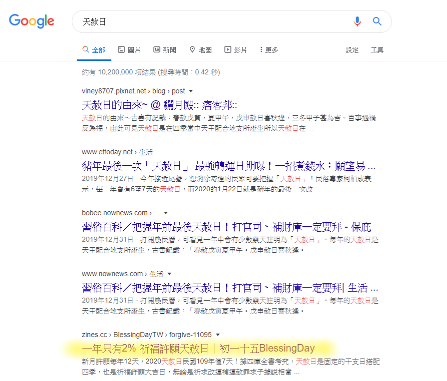 搜尋「天赦日」時,可以看到此頁面就排在SEO原生搜尋的前五名。
