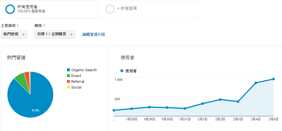 從Google Analytics的數據來看,1/27-2/5短短幾天便增加了幾百名顧客,大大提升了網站能見度。