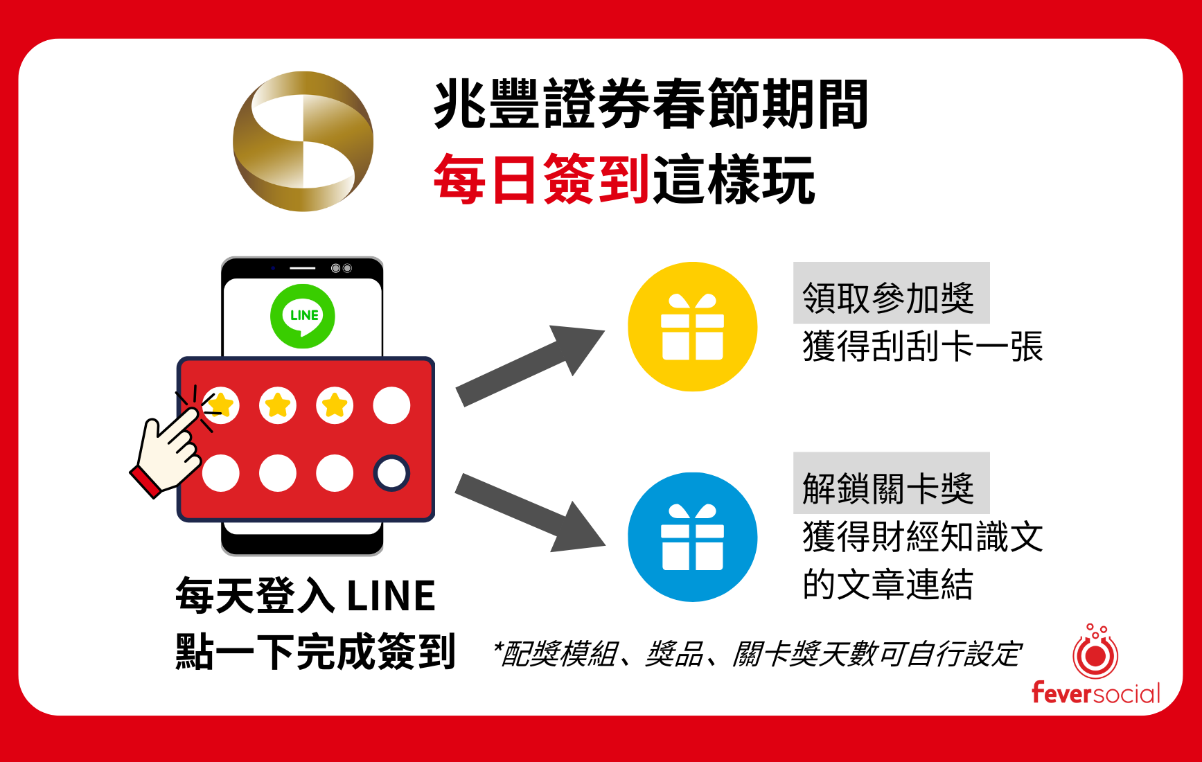誰說過年只能吃喝玩樂?兆豐證券抓準農曆春節的好時機,運用簡單好設定的「每日簽到」模組和配獎功能,觸動客戶上癮心理來達成回訪目標。更重要的是,用 LINE 推廣這樣的遊戲化互動,不只讓客戶持續參加,也吸引年輕客群加入互動,推動品牌年輕化!