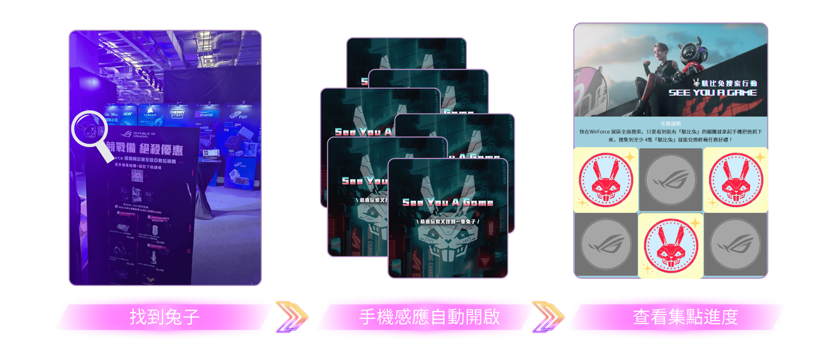 果然,ROG行銷團隊在與發燒互動團隊確認尋寶集章模式可行後,便提出以NFC貼紙取代常見的QR code,用被動感應取代主動掃描,當手機接近隱藏在駭比兔布置物背後的NFC貼紙時,集點活動頁面將自動開啟並捕捉駭比兔。此一創新設計旨在根據活動客群特性,提供一種嶄新的科技感互動體驗。