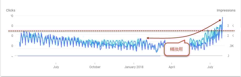 網站在今年2月底切換,經過2個月的持平,搜尋流量開始往上成長,7月超越去年流量下滑前的水平,並不斷創新高。