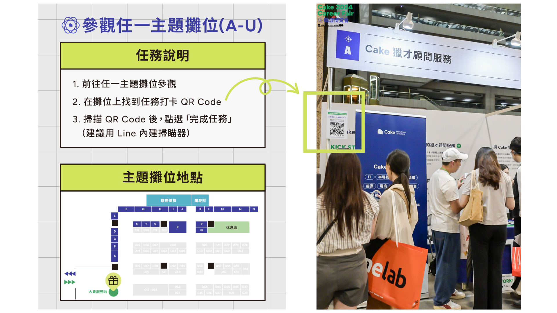 場內攤位總數非常多,超過了120多個攤位。這其中由Cake精選挑出21個主題攤位希望求職者一定不能錯過。因此設計了一關參觀任務,讓求職者從推薦清單中找出感興趣的主題攤位,如在眾多攤位中玩起了一場尋寶遊戲,抵達攤位參觀,找到Qrcode 掃描才能完成關卡任務。