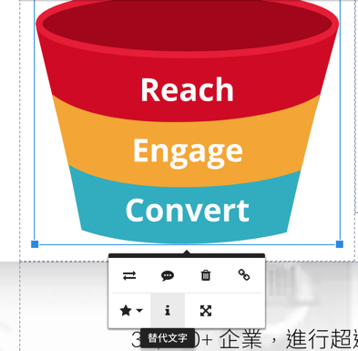 在編輯器點擊圖片後,在選單點擊「i」就可以輕鬆編輯圖片的替代文字。