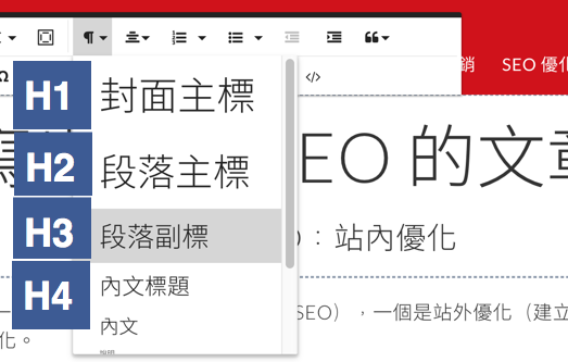 使用編輯器所內建的標題,會自動幫你加上H1,H2..的標籤。