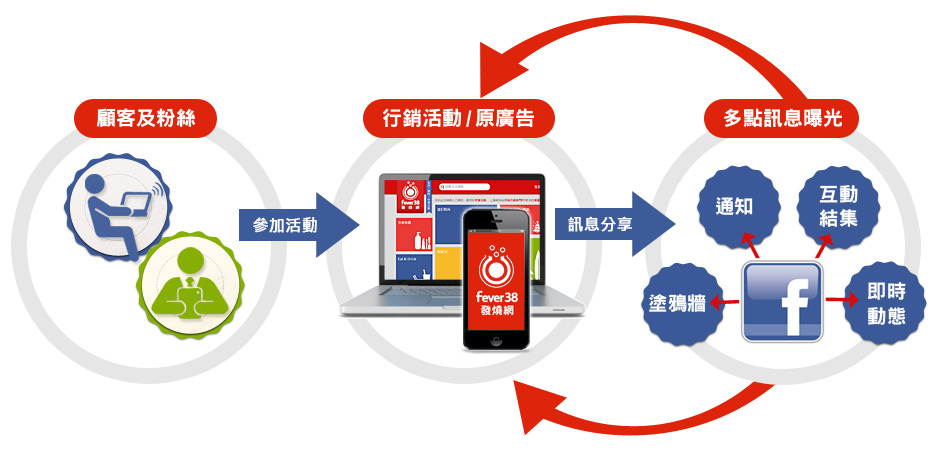 發燒互動所設計的活動模組是一種新型態的廣告模式。透過舉辦活動,將商業訊息包裝後,再透過社群的互動參與,把訊息散播到社群媒體如 Facebook。發燒互動的活動模組深度整合 Facebook 的擴散管道,網友參加活動後分享到塗鴉牆的訊息,會在 Facebook 上產生多點曝光,也會匯整在個人的 Timeline 動態時報上,得到二次曝光的機會。