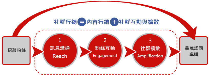 社群行銷是利用內容行銷,創造互動分享(口碑)的價值,透過朋友網絡的病毒式擴散,建立品牌認同和影響力,進而達到商業目的。很多人做社群行銷,常常只顧著眼前的業績目標,急著用獎品衝粉絲,或促銷、導購、賣東西,而忘了過程的重要性。社群行銷是一種累進式的品牌行銷過程,利用社群的特性,把品牌訊息置入互動的內容,讓粉絲在潛移默化中產生購買的興趣。