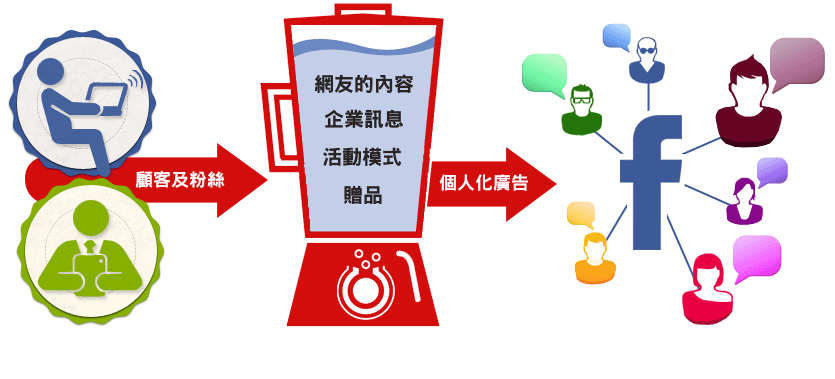 網友透過參加活動,所發佈到塗鴉牆的訊息就是一種個人化廣告,也就是傳統的口碑行銷。猶如圖中示意的果汁機,網友在參加活動過程中,幫商業訊息加「料」,把活動主設計的訊息,經過加工後,創造多樣化且個人化的內容,以病毒的方式擴散到自己的社交網絡。