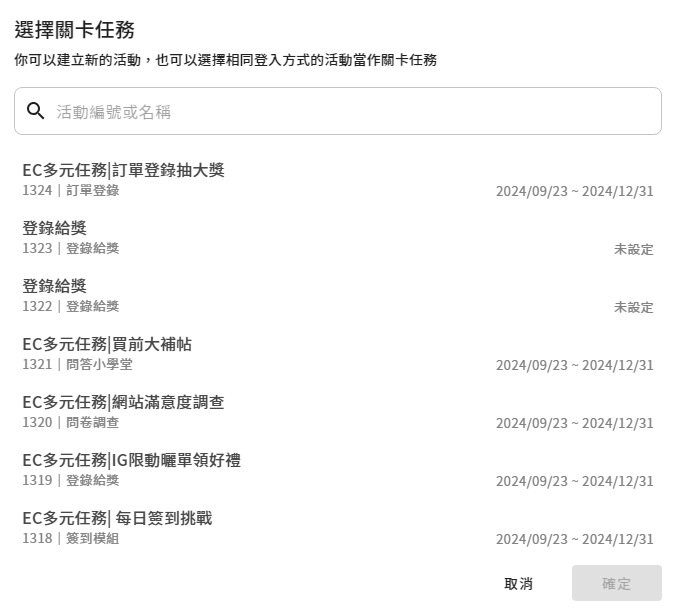 靈活設定關卡數量,並關聯發燒互動提供的不同活動模組,可選擇已建立甚至在進行中的活動,例如官網上的產品推薦心測,可納入準客任務中。