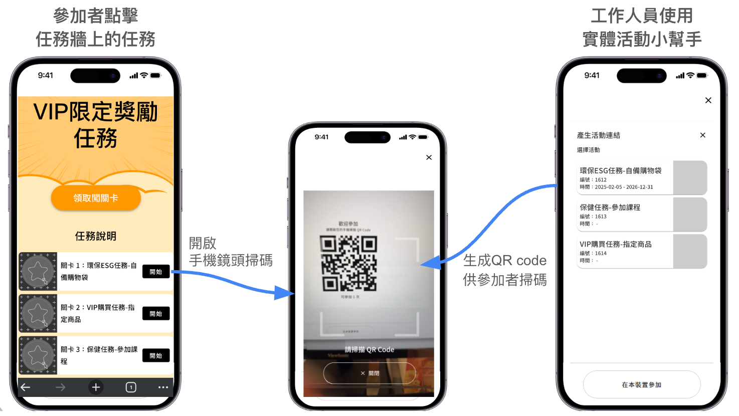 主辦單位可以在實體場域佈局打卡點,任務關卡可設定為打開手機掃描每個關卡的 QR code 完成任務。