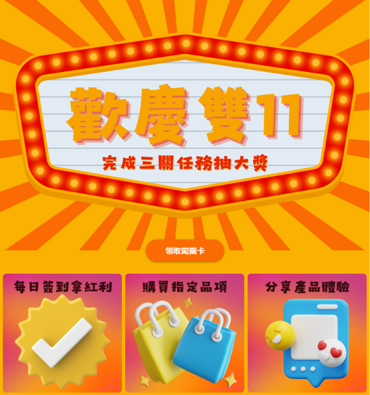 可設計只要完成任一個任務就送的普獎,也可設計需要完成指定數量的任務才能解鎖關卡獎,吸引玩家積極完成挑戰,達到深化品牌體驗的目的。