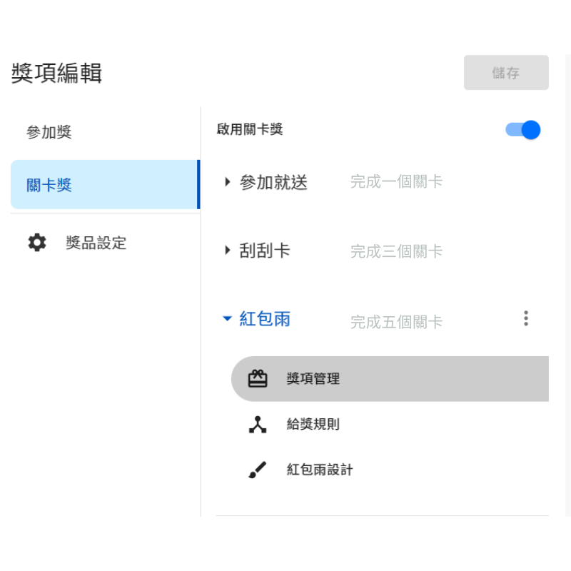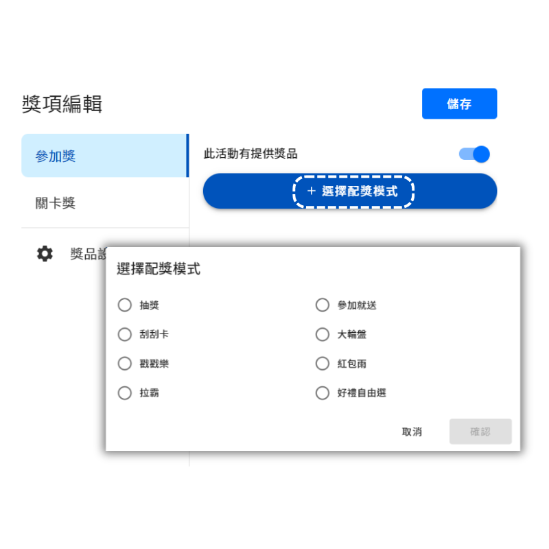支援參加獎及多個關卡獎,每個階段皆可任選不同的配獎模式。