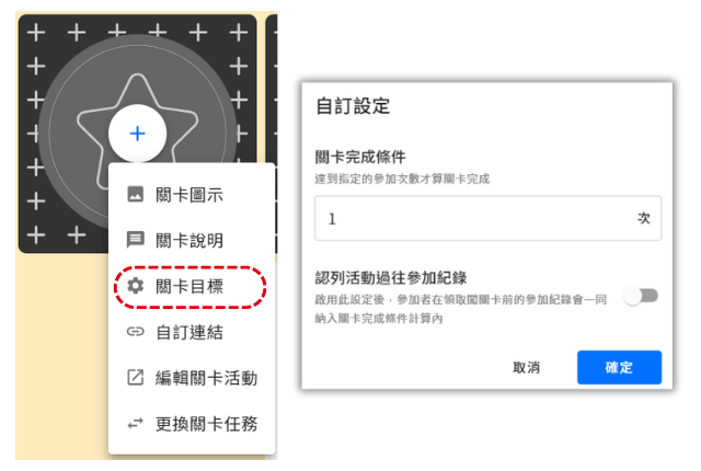 品牌可以設定每個關卡需達到指定參加次數才算完成,例如,圖片上傳活動至少上傳2張圖片,簽到活動需累積簽到3次。