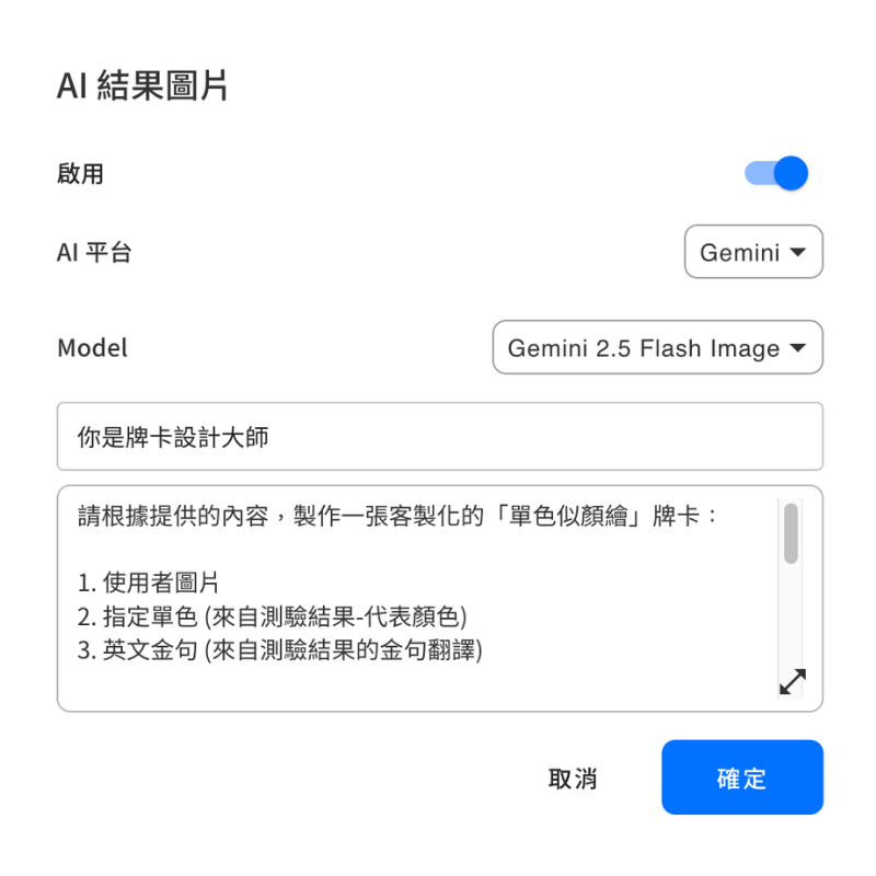 我們在心測模組加上了 AI 生成功能,AI 可以動態根據用戶的個人答題結果生成結果內容和結果圖片。你可以完全掌控 AI 生成的提示詞—用戶在心測過程中的題目、答題選項、上傳的個人照片以及結果內容都會餵進 AI 當作生成的元素。