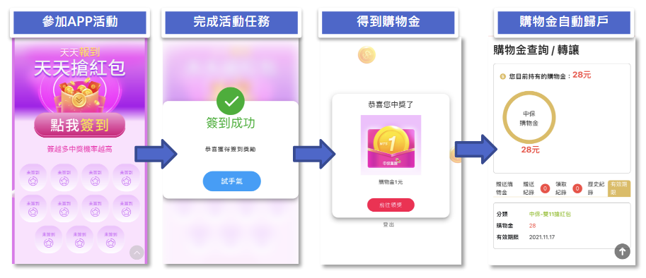 透過獎品歸戶API串接,參加活動所得到的優惠券及點數可自動歸戶到會員券夾。