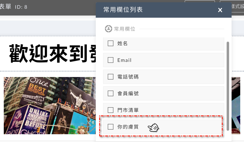 如果你經常性要蒐集某些特定的欄位資料,比如你是化妝品業者,你想蒐集顧客的膚質,你就可以把這個選單儲存起來,未來在建立新表單的時候,可以拉出來重複使用。