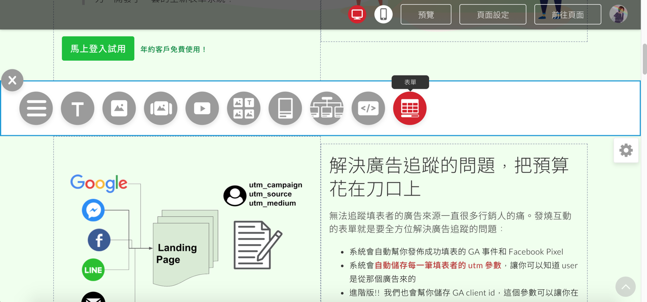 你可以在發燒互動的網頁編輯器直接嵌入你製作的表單!表單可以嵌入不同的頁面,這樣你就可以測試哪一個 Landing Page(著陸頁)會帶來更有效的名單。