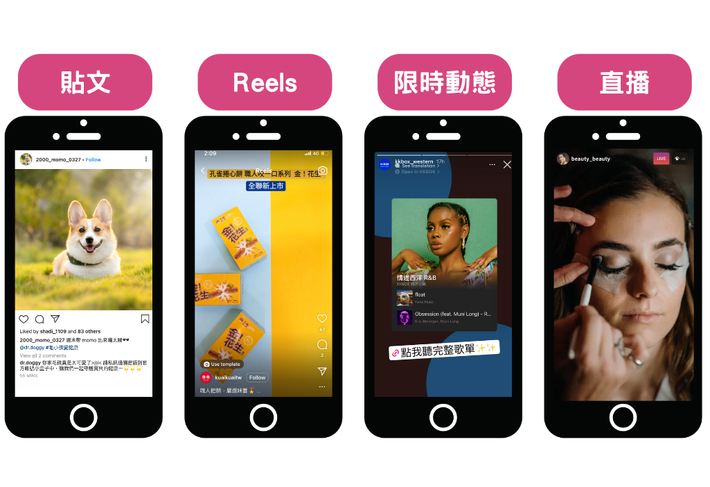 Instagram 有許多與群眾接觸的管道,目前品牌經常使用的有 —— 貼文、限時動態、Reels 短影片、Live 直播。