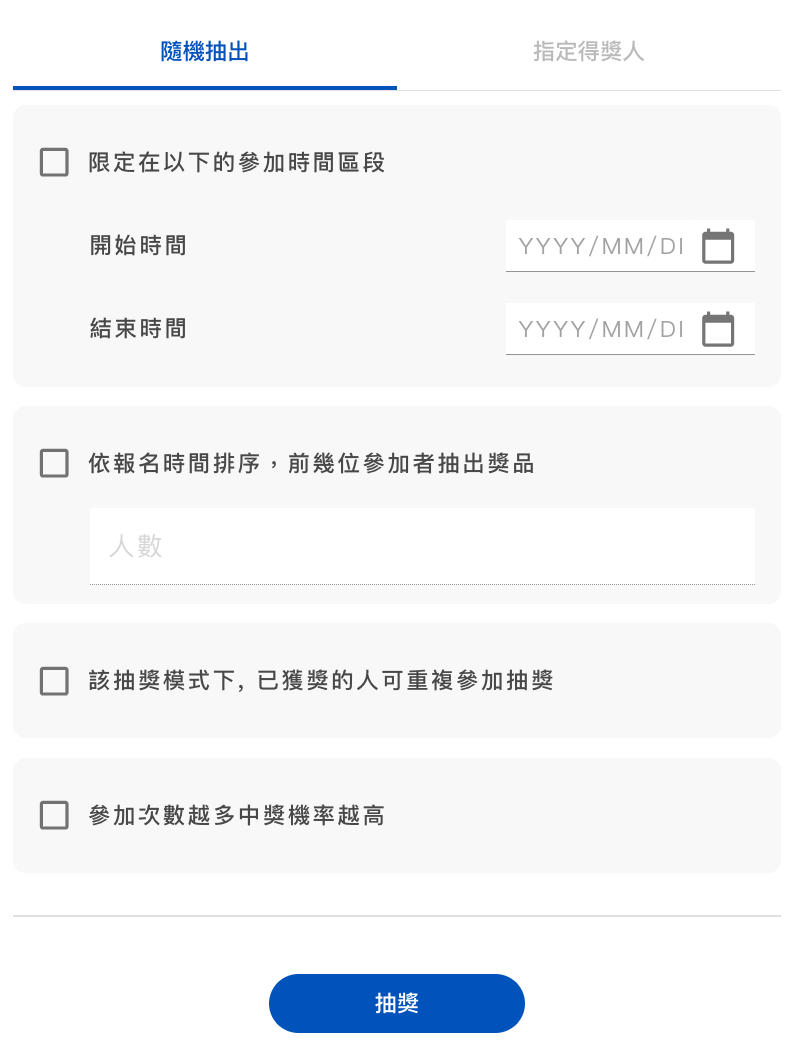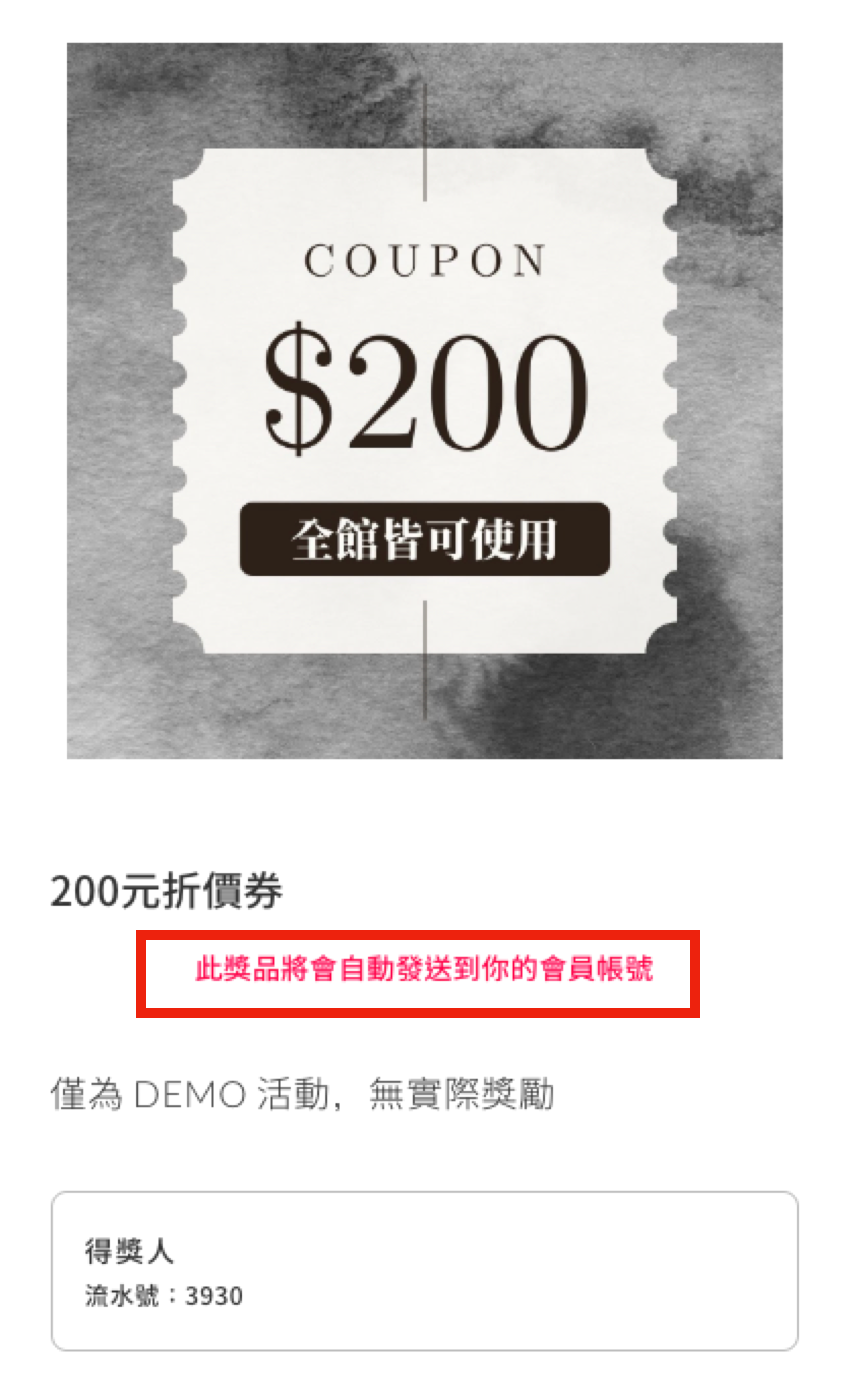 於活動進行中或結束後,可針對所有登錄的訂單統一進行大抽獎,適合大獎的發送。