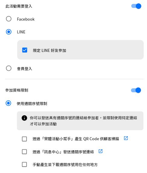 運用一人一密碼卡控活動參加資格,可搭配社群或會員登入,也可以單獨使用, 讓你的行銷活動設計更靈活、更具專屬感!