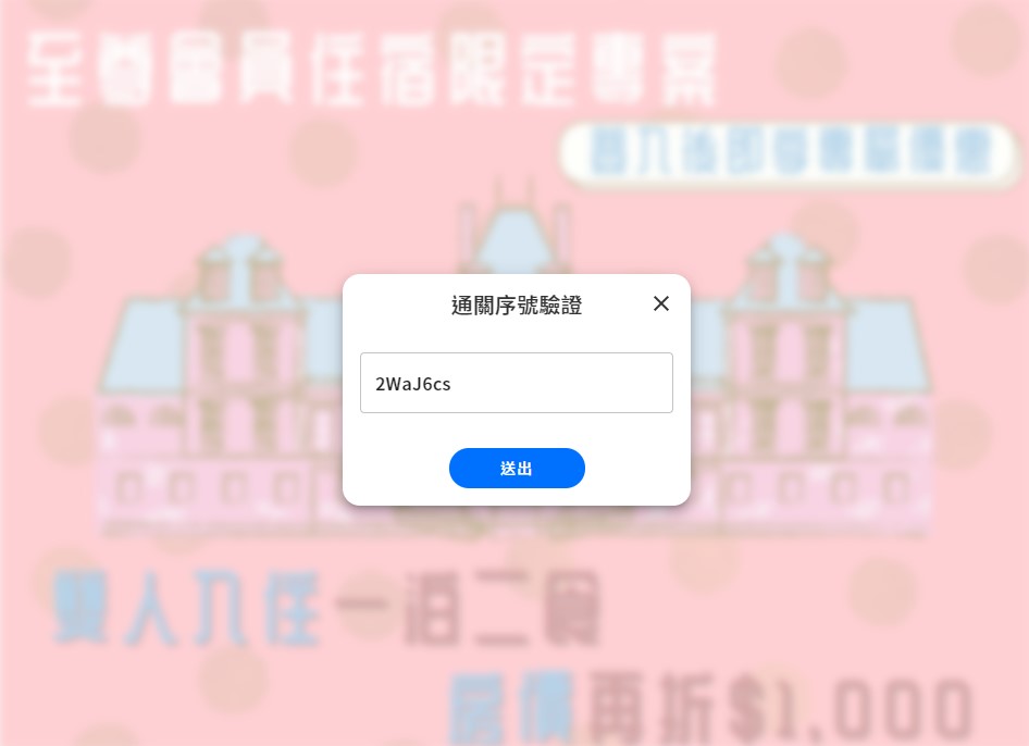 情境示意:你是一家星級飯店,提供限量住宿優惠券給合作品牌做為會員獎勵。合作夥伴將你提供的通關序號發送給符合資格的會員,收到通關密碼的人才能兌換專屬優惠券。