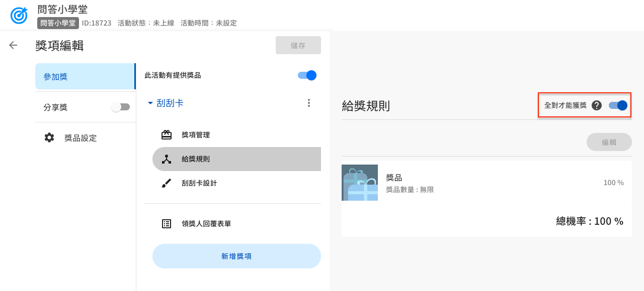 藉由這項設定,可以讓活動更有挑戰性,參加者必須所有題目都回答正確才能獲得遊戲配獎/抽獎機會!