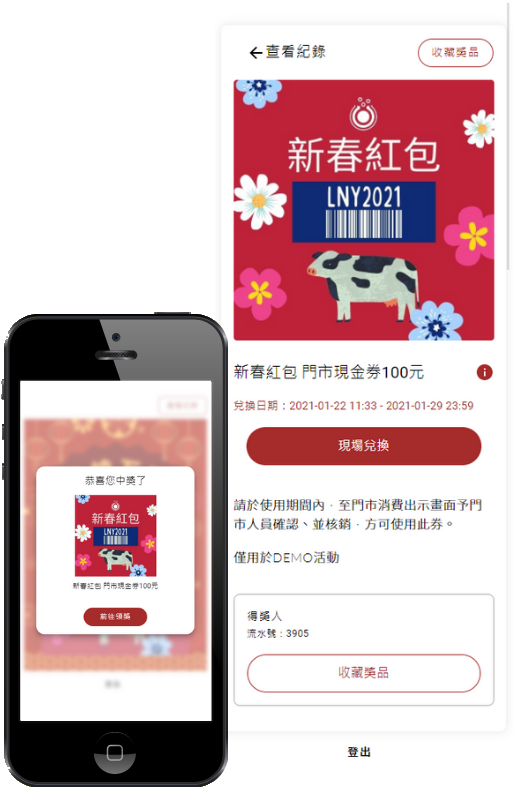 不同獎品類型可自行搭配出「寄送贈品」、「O2O實體店鋪兌換券」、「線上EC折價券」、「不重複序號獎」等多種應用情境。 實體兌換的序號系統會產生 barcode 條碼及 QR code 方便門市人員掃描。如果你的網路商店接受序號,也可以在優惠券設定兌換網址。需要寄送的獎品,可以使用得獎人表單自訂需要收集資料欄位。
