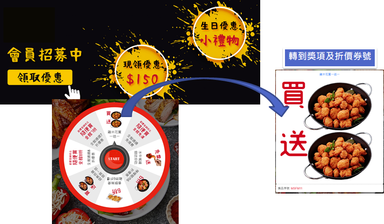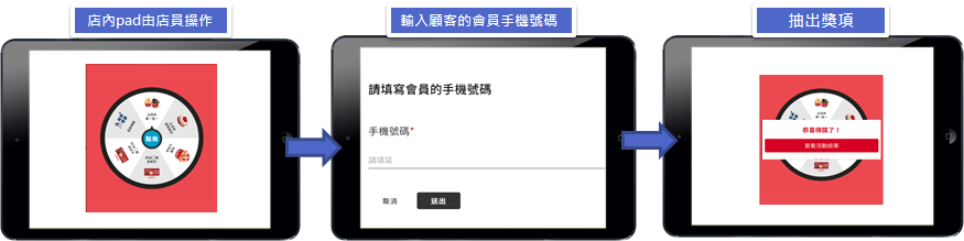 方式1: 可將活動顯示在平板電腦,由結帳櫃檯的工作人員操作,讓用平板顧客當場轉輪盤。此方式簡單但比較不嚴謹,適合送需在現場立刻核銷的獎品。
