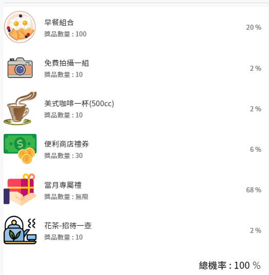 針對每個獎品設置發送的數量及中獎機率,只要組合機率總合為 100% 即可。